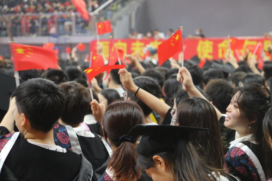 典礼现场,同学们挥动着手中的五星红旗。小小的红旗,是心中的一团火,他们秉持家国情怀,感受时代脉搏,发出“强国有我”的铮铮誓言,以青春之我建设青春之国家。